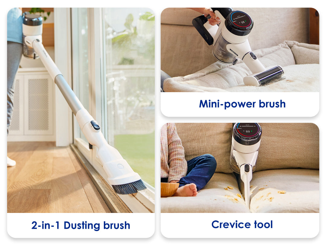 Special Feature | ● Automatically adjustment of suction. ● Smart detection of unseen dirt on the floor and in the carpet. ● One-touch trigger wipes dustbin clean. ● 5-stage HEPA filtration captures 99.9% small particles. ● Specially-designed brush effectively targets hair messes and traps hair without wrapping. |